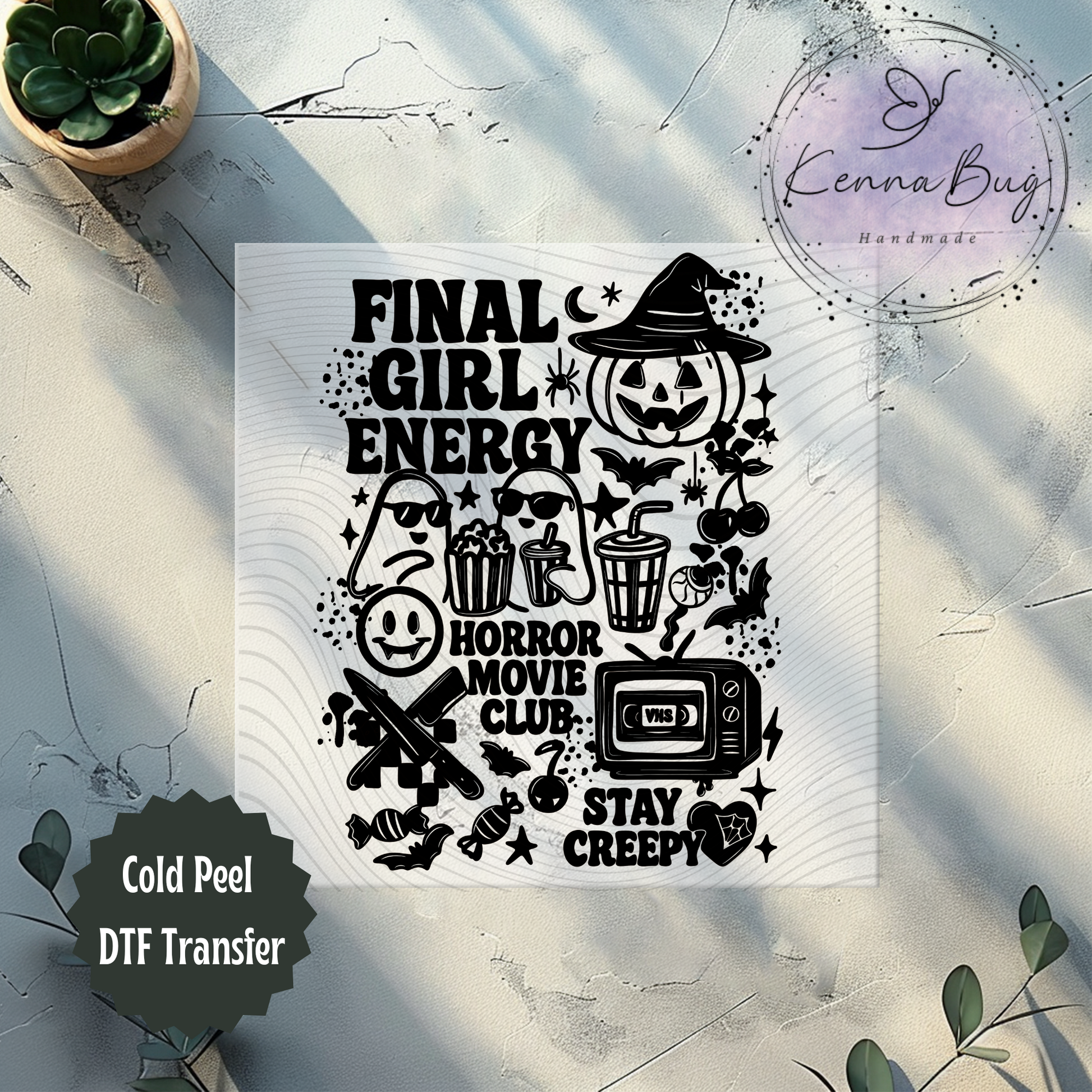 Final Girl Energy, Horror Movie Club, Stay Creepy, Halloween, Black, DTF Transfer, Ready to Press, Shirt Transfer, Heat Transfer, Direct to film Transfer