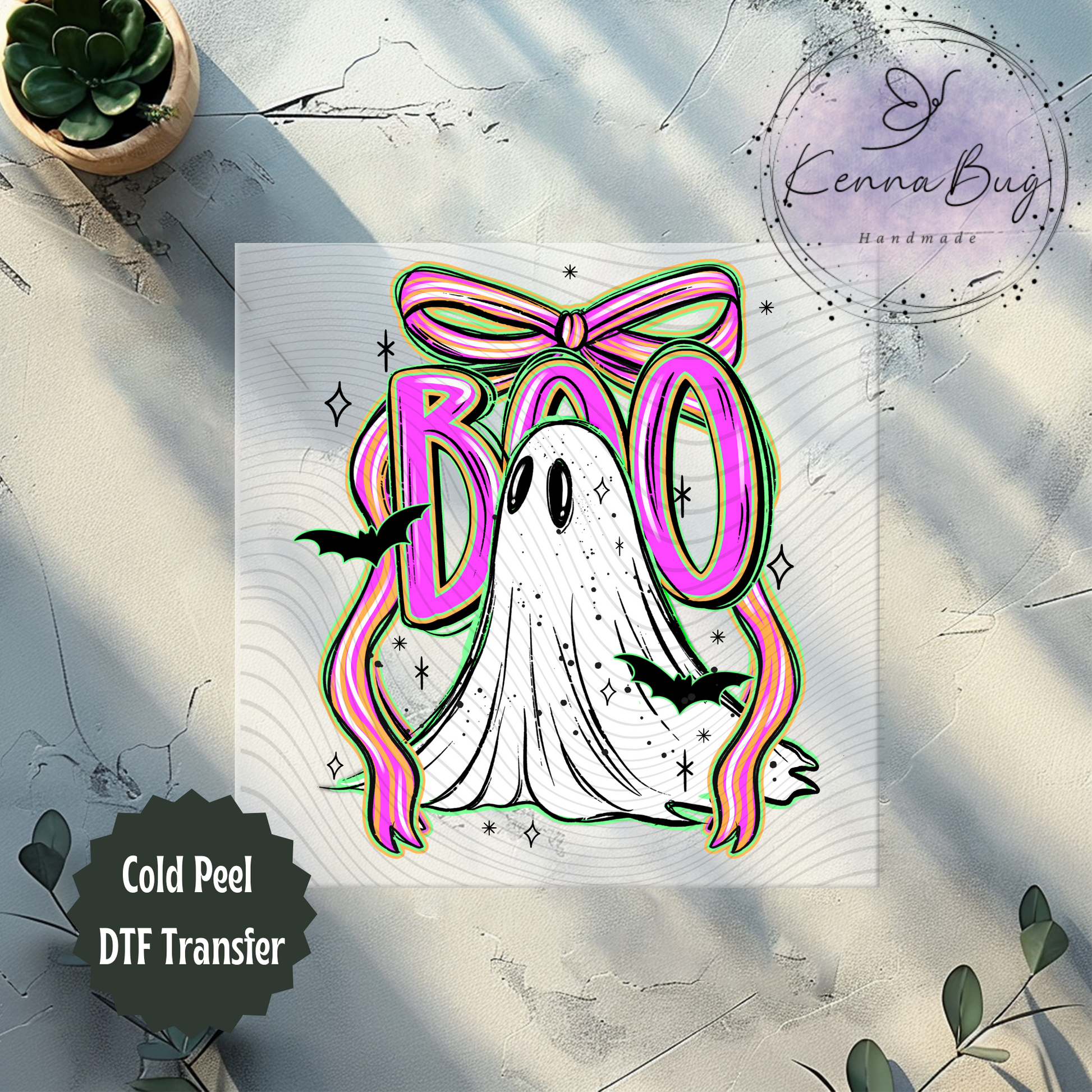 Striped Bow, Pink Boo, Ghost, Halloween, DTF Transfer, Ready to Press, Shirt Transfer, Heat Transfer, Direct to film Transfer
